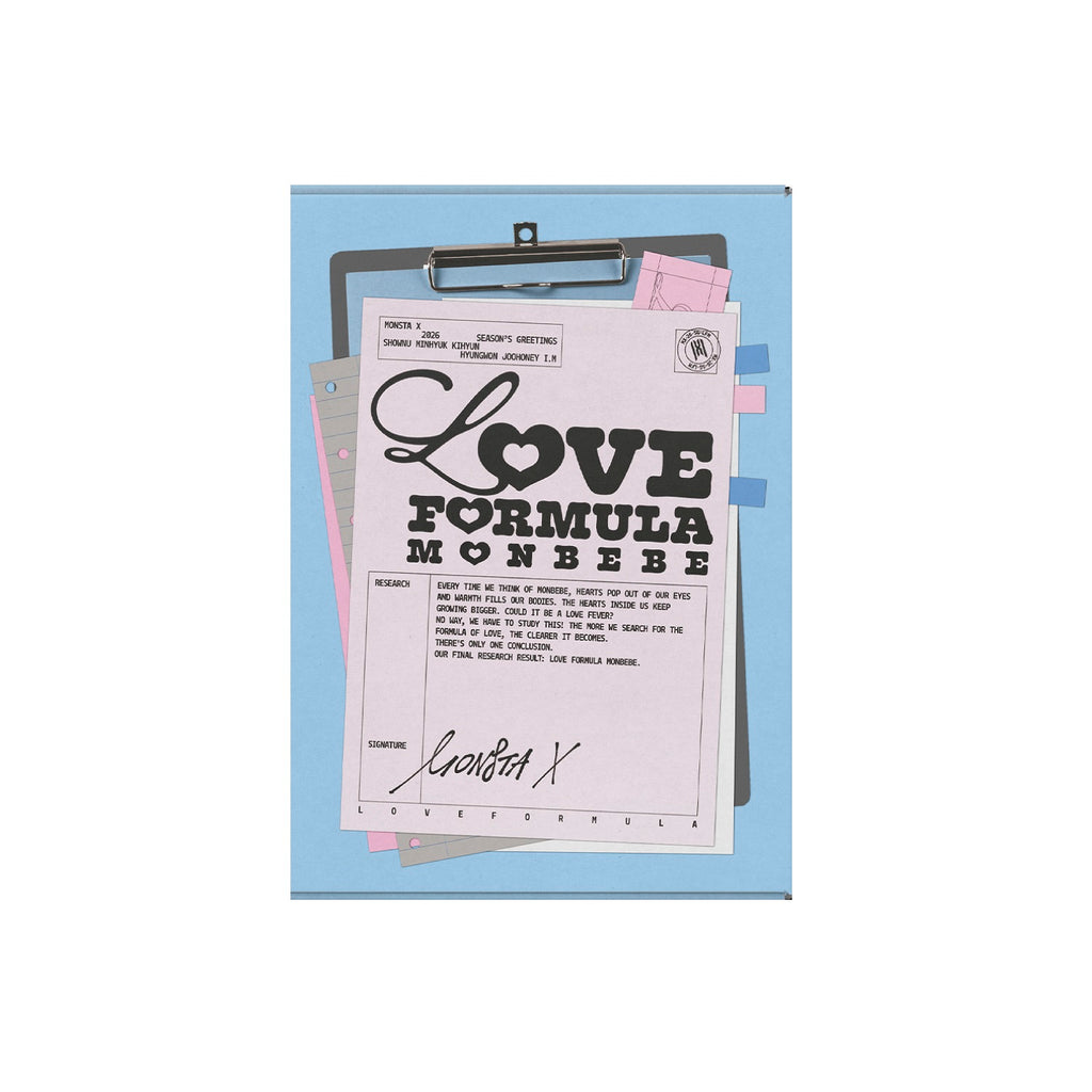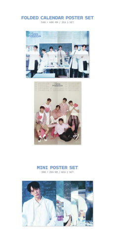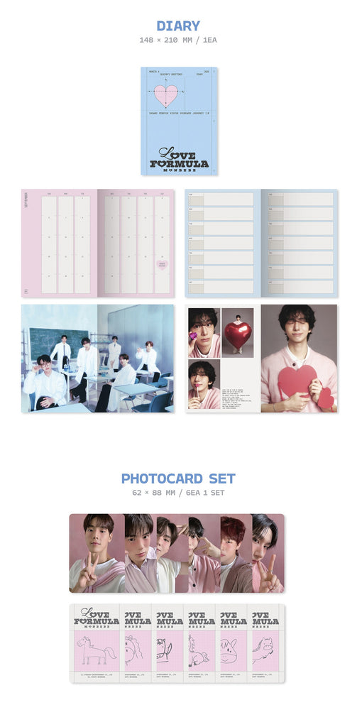 Desk Calendar + Diary + 6 Photocards + 2 Folded Calendar Posters + 6 Mini Posters + 6 ID Photos + 6 Monbebe Reports + Clip + QR Code Card