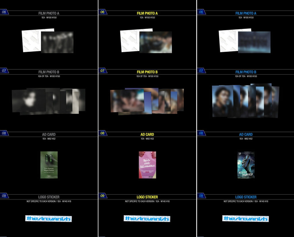 CD + Tabloid + 16p Lyric Book + Film Photo A + Film Photo B + AD Card + Logo Sticker + Sticker Set + Flyer + Photocard A + Photocard B