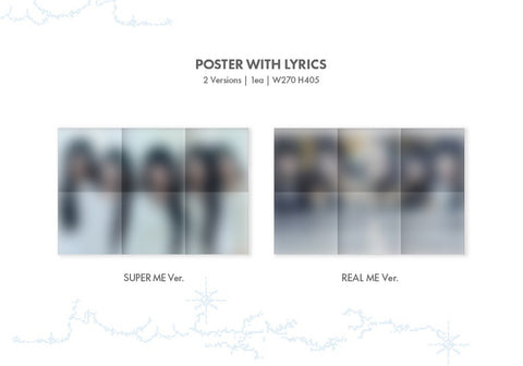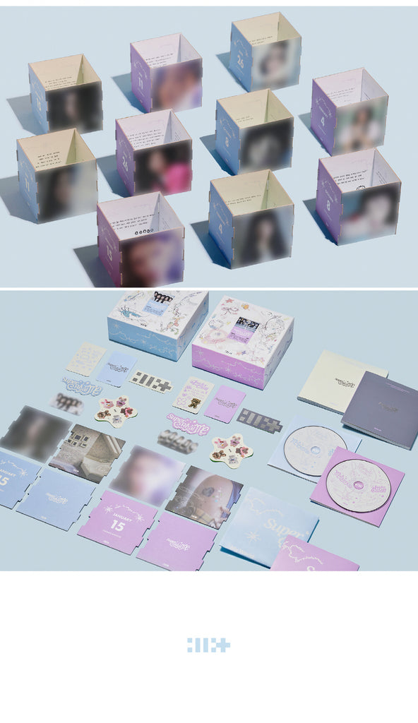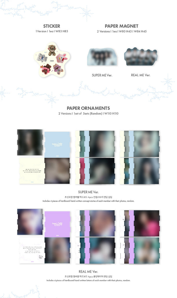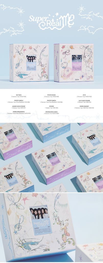 CD + Super : 72p / Real : 76p Photobook + Photocard A (Random 1 out of 5) + Photocard B (Random 1 out of 5) + Illit Logo Sticker + Album Logo Sticker + Sticker + Paper Magnet + Paper Ornaments (Random 1 out of 5 Sets) + Poster with Lyrics (On Pack)