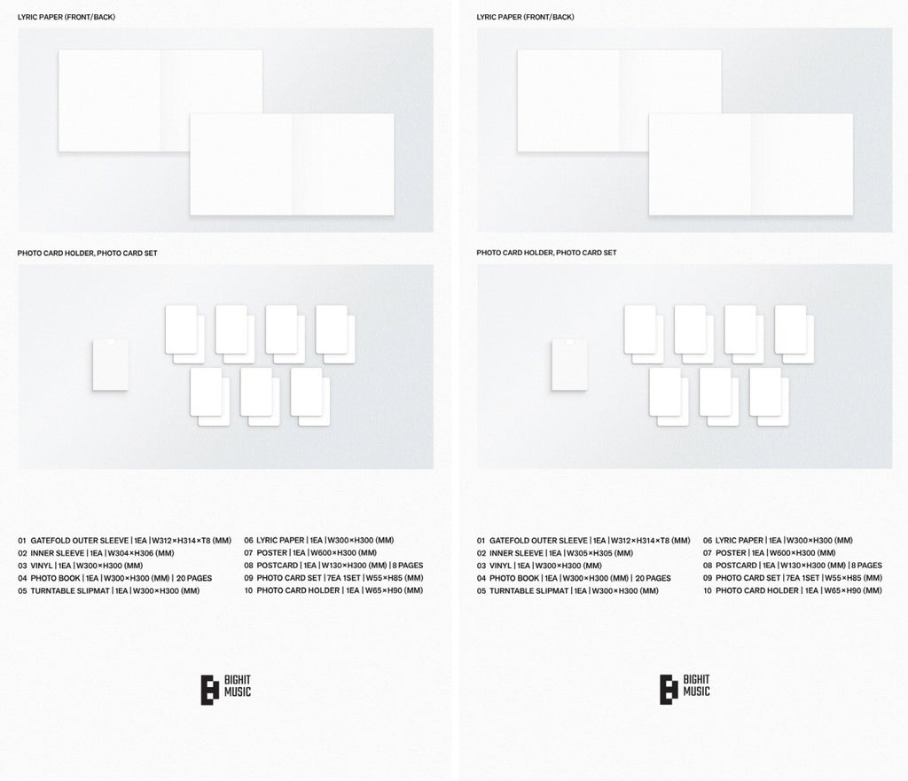 Vinyl + Gatefold + Turntable Slipmat + 20p Photobook + Postcard + Poster + Lyric Paper + Photocard Set + Photocard Holder