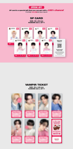 Vampir Ticket (Random 1 out of 7) + Concept Photo (7p) + SP Card (Random 1 out of 7) + Coupon Card + Making Photo + Door Hanger + Removable Sticker (7p) + Concept Photo Frame + Masking Tape