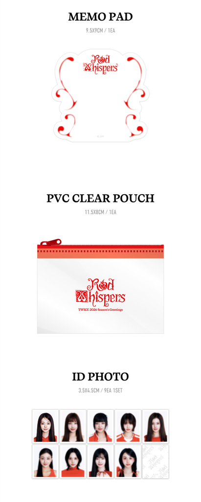 Desk Calendar + Diary + Mini Poster + Selfie Photocard + Removable Sticker + Memo Pad + PVC Clear Pouch + ID Photo + Polaroid + Message Card + Photo Index