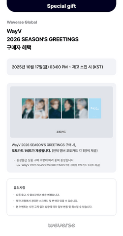 Pre-order Gifts will only be presented to products purchased during the pre-order period. If you place an order after the release date of the album, pre-order gifts will not be presented when the pre-order gifts are exhausted.