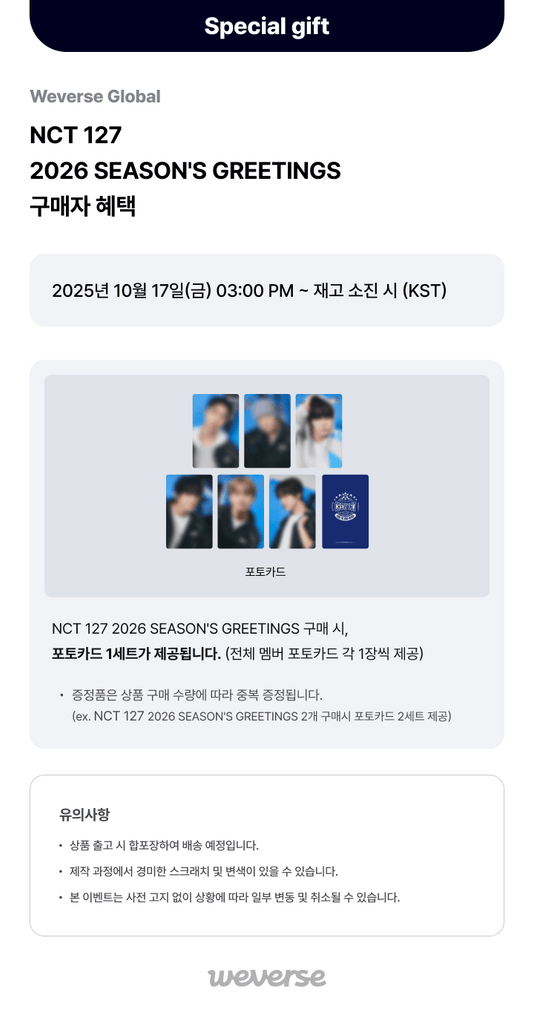 Pre-order Gifts will only be presented to products purchased during the pre-order period. If you place an order after the release date of the album, pre-order gifts will not be presented when the pre-order gifts are exhausted.