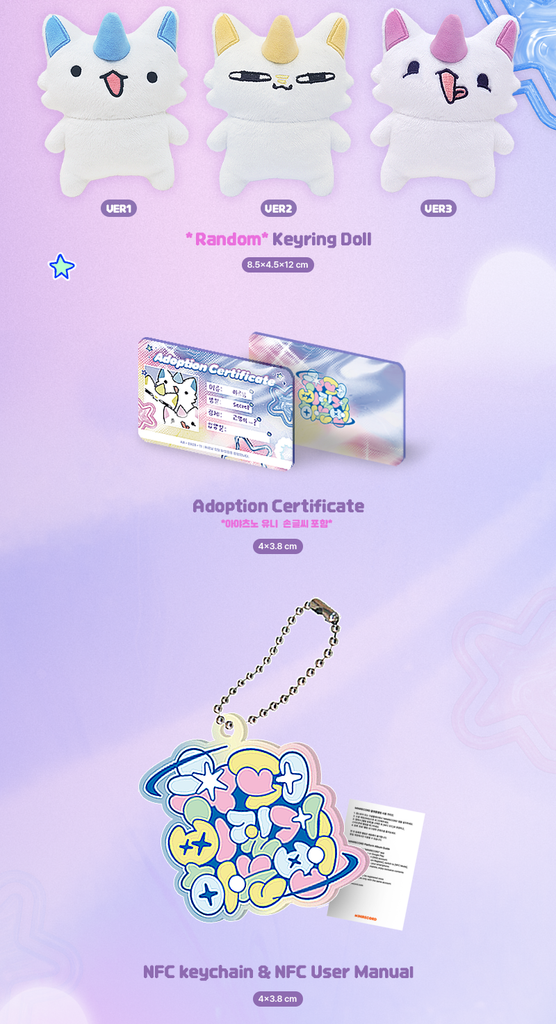 Keyring Doll + Adoption Certificate + NFC Keychain & NFC User Manual + 4 Lyrics Postcards + Photocard (Random 1 out of 3)