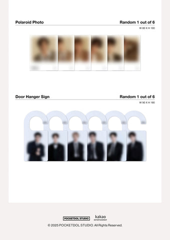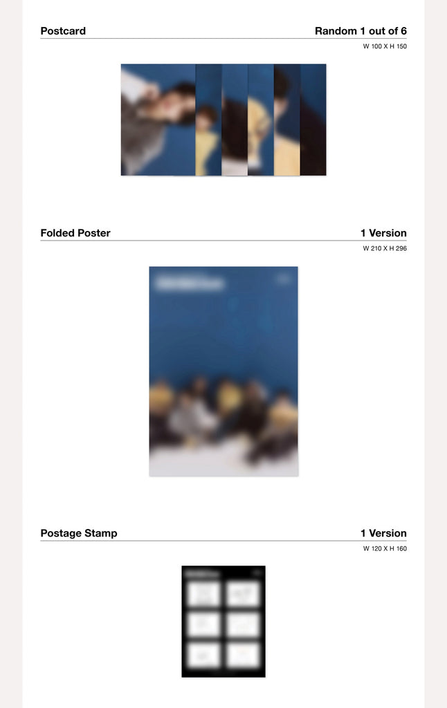 Photobook + 2 Photocards (Random 2 out of 36) + Postcard (Random 1 out of 6) + Folded Poster (On Pack) + Postage Stamp + Film Photo (Random 1 out of 6) + Door Hanger Sign (Random 1 out of 6)