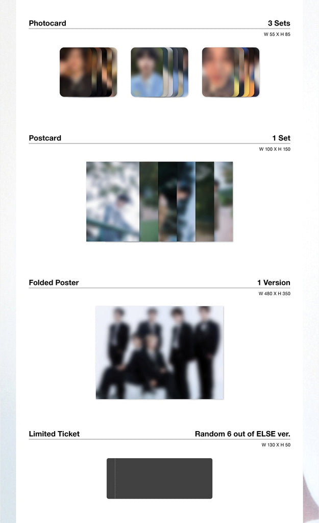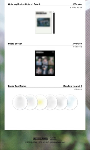 Photobook + Photocard 3 Sets + Postcards + Folded Poster (On Pack) + 12p Coloring Book & Colored Pencil + Photo Sticker + Lucky Can Badge (Random 1 out of 6) + Limited Ticket (Random 1 out of 6)