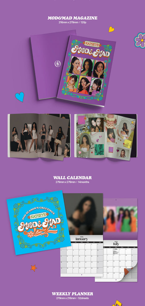 120p Mod&Mad Magazine + 14 Months Wall Calendar + Weekly Planner (52 Sheets) + 4-Cut Photos (6ea) + 9 Photocards & 2 Photocard Deco Frames + 3 Posters (On Pack) + Sticker + Digital Code