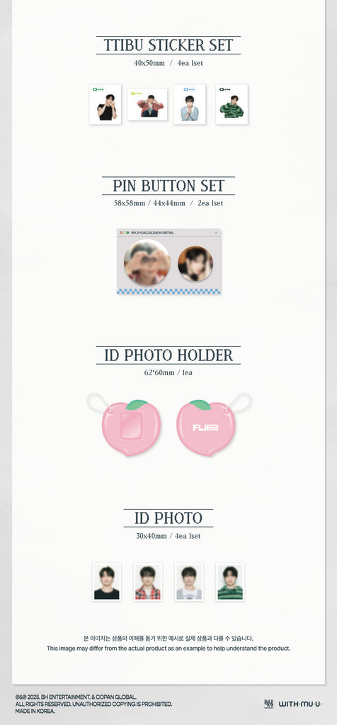 26p Desk Calendar + 160p Diary + 4 Film Photos + 12 Photocards + Folded Poster (On Pack) + 4 Ttibu Stickers + 2 Pin Button + ID Card Holder + 4 ID Photos